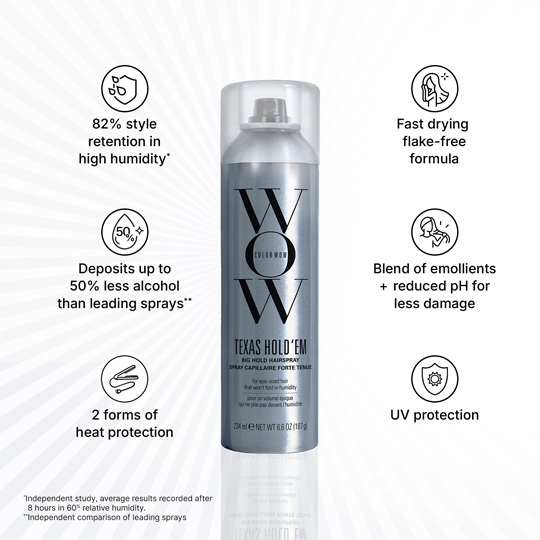 Texas Hold Em - a super strong hold hairspray that delivers long-lasting style, hold & control, heat protection and powerful humidity-resistance.